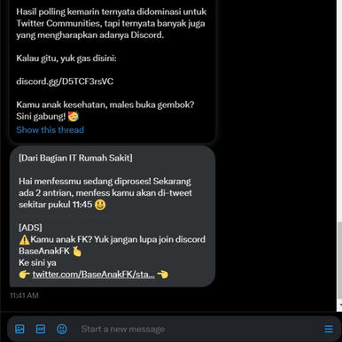 Promosi dapat dilakukan dengan jeda 3 jam setelah menfess promosi lain dipost.